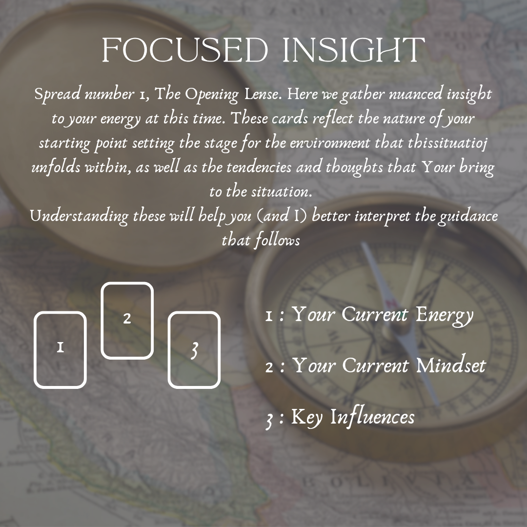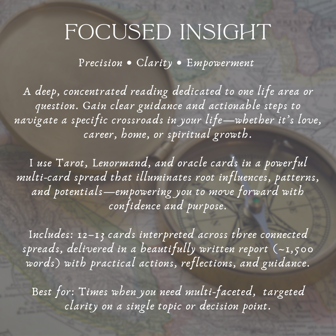 When one specific situstion is keeping you up at night, and you wish you couls just illuminate the path ahead. The Focused Insight Reading offers deep, compassionate guidance dedicated to one life area or decision point, helping you move forward with clarity and confidence. More targeted and focused than a general reading I approach the same situation from multiple angles and a magnifying glass to make sure you have a clear foundation to make your decisions from.