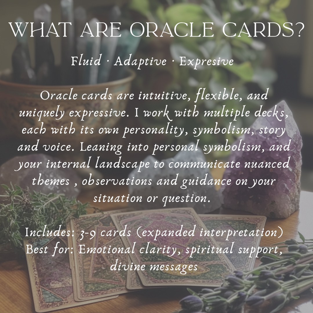 Oracle cards are intuitive, flexible, and uniquely expressive. I work with multiple decks, each with its own personality, symbolism, story and voice. I’ll select the one that best matches your energy or you may choose from a selection of decks shown in the photos below. Oracle readings lean into personal symbolism, and your internal landscape to communicate nuanced themes , observations and guidance on your situation or question.